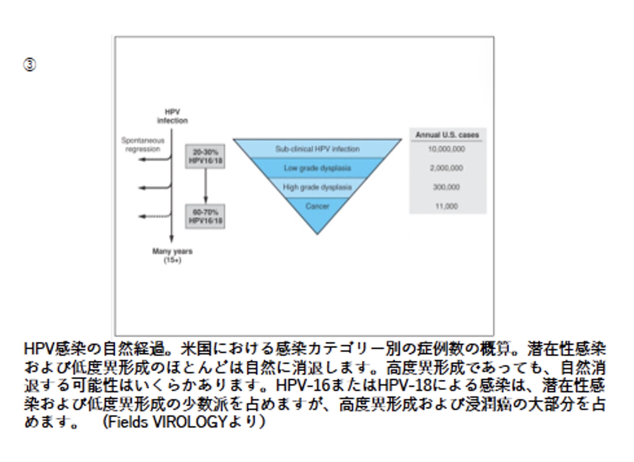 HPVは世界の子宮頸がんのほぼ全症例の原因であり、頸がんは女性がんの死亡原因の第二位を占め(第一位は乳がん)、約10%を占める。頸がん発症の80%は発展途上国で発生。HPV感染から悪性化までは10年以上かかり25歳未満は非常にまれ。その後年齢とともに多くなる。性器HPV感染症のほとんどは良性、無症状で自然に治癒する。軽度の子宮頸部異形成に関連する感染症も多くが自然治癒。高度異形成の持続感染(6か月以上)は前がん病変として治療対象と認識されている。USA女性の性器HPV感染の生涯リスクは少なくとも75%と推定。