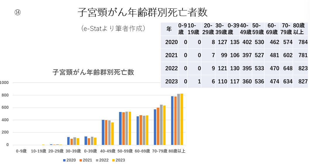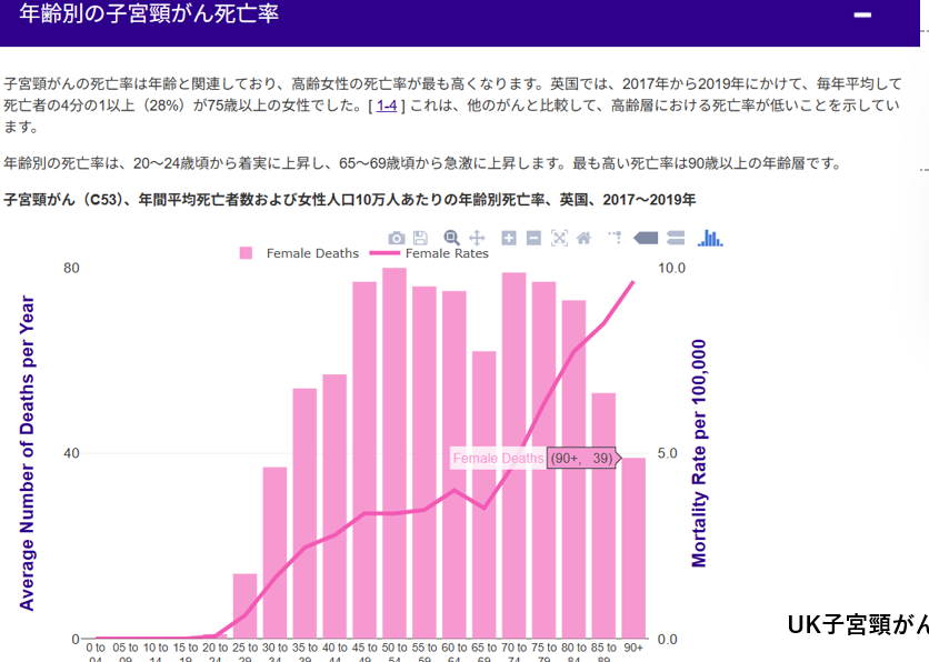 参考補足としてUSAでのHPV感染の自然経過、UKでの1971年から2019年までの子宮頸がんの年齢群別死亡率統計、2020年から2023年までの日本での子宮頸がん年齢群別死亡者数を示す。