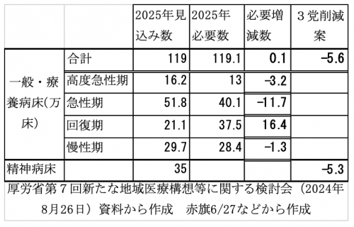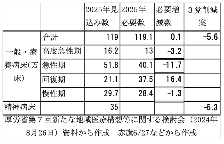 7月2日の党首討論会で、石破首相は、消費税減税はある意味「ばらまき」、社会保障費減額を自・公と維新との合意に基づき「改革」を進めると表明しました。「医療費4兆円削減」「11万病床削減」計画を推進すると表明したのです。この2月に3党は、2027年までの2年間に病床11万床削減、最低4兆円の医療費削減を「骨太方針」に反映、6月6日には自・公・維新で正式合意していました。 下表右端列のように、削減病床の内訳は、一般・療養病床を5.6万床、精神病床5.3万床です。今回は前者について検討します。 昨年8月26日の厚労省「第7回新たな地域医療構想等に関する検討会」では、2025年必要病床を、「高度急性期」13万床、急性期40.1万床、回復期37.5万床、慢性期は28.4万床と、コロナ禍でのこれら医療施設の充実が強く求められたことを忘れたかのように、不当にも大幅に減らしました。それでも、回復期に関しては37.5万床必要とし、その見込み数より16.4万床増やす必要があるとしています。その必要総数は119.1万床でした。(下表)