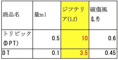 同報告書は、DTaP0.5mlとDT0.1mlの効果・副作用を比較しています。まず、添付文章に記載された抗原量は次表のように、ジフテリア抗原(Lf)はDTaPが10㎍で、DT(3.5㎍)の約3倍でした。破傷風の抗原量には両者に大きな違いがありませんでした。