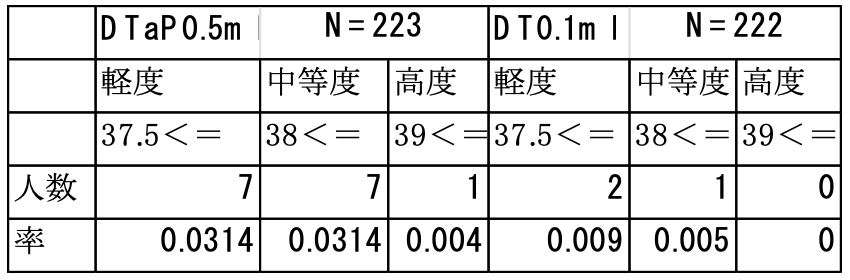 次に、副作用の、客観性が高い「発熱」を比較すると(右上表)、「軽度」がDTaPの223人中7人に対しDTは222人中2人,中等度でそれぞれ7人対1人,重度で1人対0人でした。予想どおり、DTaPの方が発熱率は高かったのです。これが、ジフテリア抗原量の差だけかどうかはわかりませんが、DTaPの方が副作用が多い可能性が示されていました。
