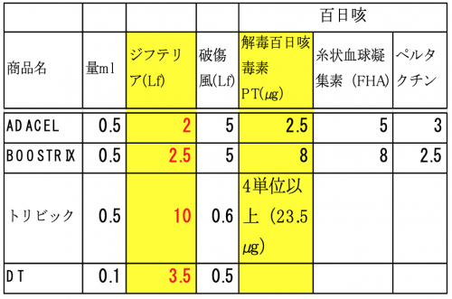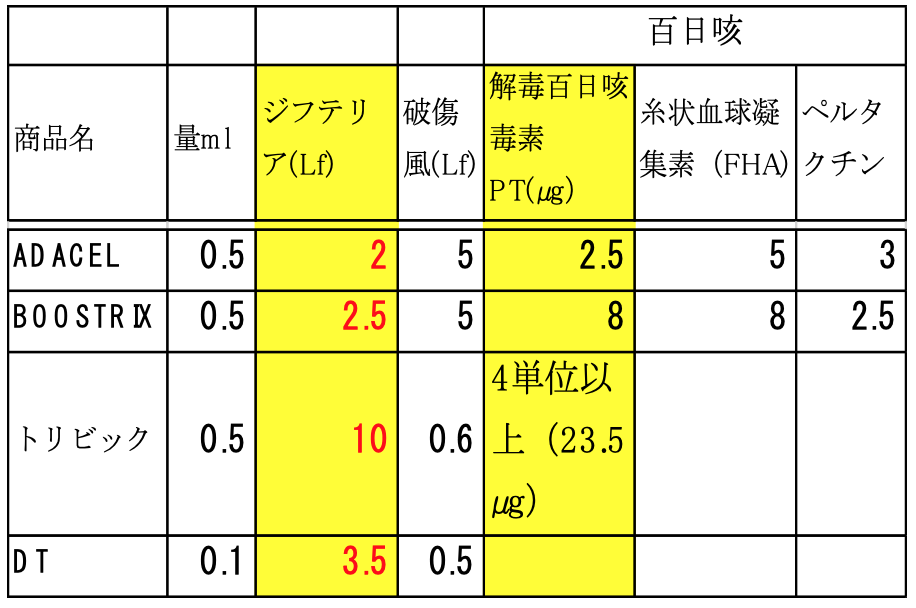 アメリカで年長・成人に接種されている3種混合Tdap(下表ではADACELとBOOSTRIX)のジフテリア抗原が、それぞれ2Lfと2.5Lfであり、日本のDTaP(商品名「トリビック」)での10Lfの、4-5分の1になっています。不活化百日咳毒素PTも「トリビック」の3-9分の1になっています。