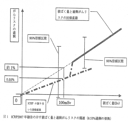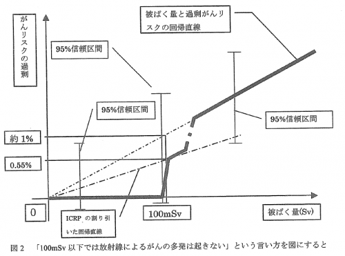 最後に岡山大の津田敏秀氏の講義から原爆被曝後のがん発症の0-100mSV問題についての講義をしめす。がん発生に100mSV 閾値があるという主張は間違いということを図表で示している。閾値なしの左図に比べ、右図が閾値あり主張の図示である。林氏の分析と合わせて100mSVに閾値ありという主張の誤りは一目瞭然である。