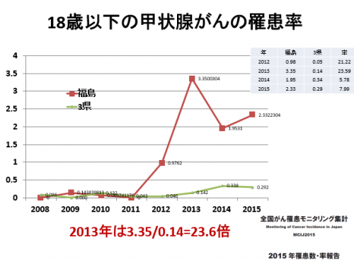 福島県では、2011年の原発事故後、18歳以下の小児すべてを対象に甲状腺のスクリーニング検査を行った。小児甲状腺がんの頻度はもともと年間15歳未満で通常1-2/100万人いるかいないか、比較的頻度の高い18歳以上を含む15-19歳でも1.2/10万人(国立がん研究所より)である。ところが、福島の原発事故が2011年に起こった次の年から2015年までの18歳以下の小児甲状腺がんの罹患率は、2011年9月から2012年3月までの18歳未満の検査実施者38114名中10名が甲状腺がんだったことを皮切りに、毎年増加を続けてきている。上のグラフは、福島原発事故以前から行われていた全国がん罹患モニタリング集計(意図的にかどうかはわからないが、全国がん罹患モニタリング集計事態が2015年に打ち切りとなった)での、基準となる3県(山形、福井、長崎県)に対する福島県の18歳以下の甲状腺がんの罹患率の推移を示したものである。2012年が21.2倍、2013年が23.6倍、2014年5.8倍、2015年8.0倍となっている。